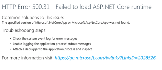 HTTP Error 500.31 - Failed to load ASP.NET Core runtime
