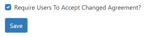 In addition, there is an option to 'Require Users To Accept Changed Agreement?'. If ticked, this will prompt users to accept revised terms when they login after any change to the Registration Agreement text. It is advisable to be confident in the text before enabling this option.